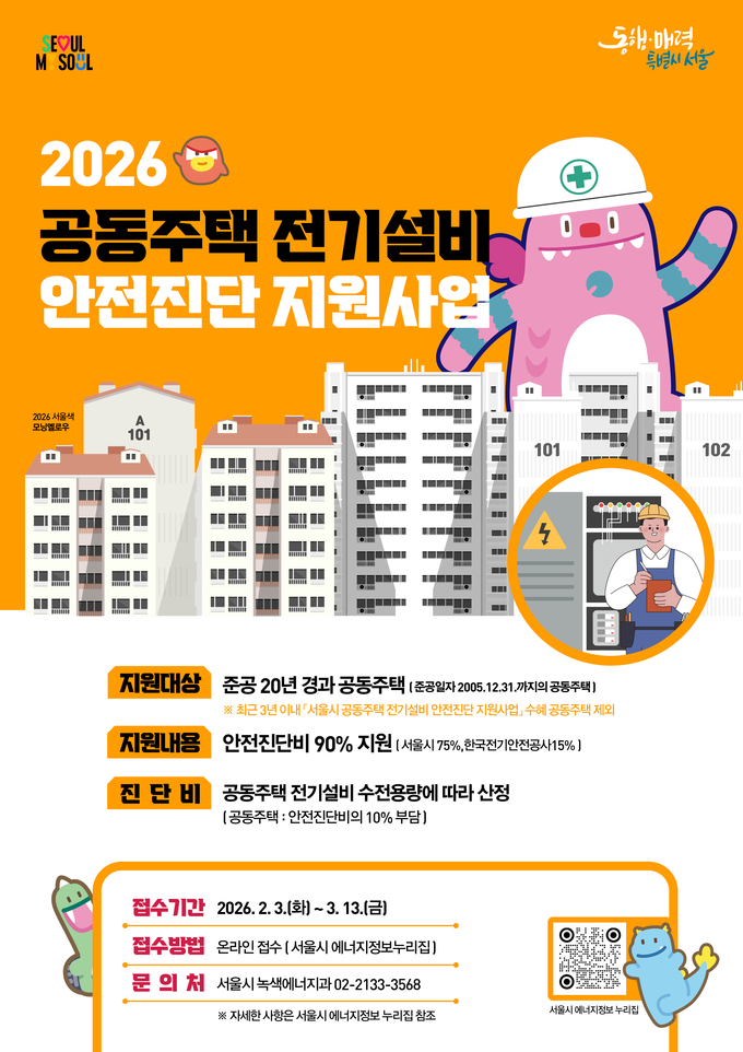 서울시가 한국전기안전공사와 함께 노후 공동주택의 정전사고를 사전에 차단해 생활 안전을 강화하는 ‘2026년 공동주택 전기설비 안전진단 지원사업’을 추진한다고 11일 밝혔다.