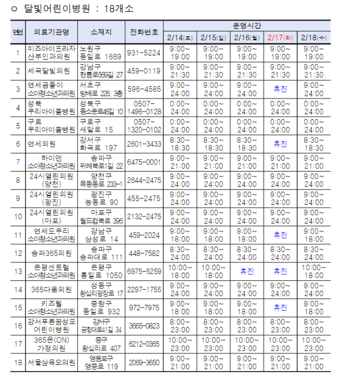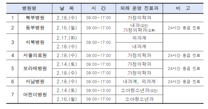 특히 시립병원 중 서울의료원, 보라매병원, 동부병원, 서남병원은 설 연휴 기간 24시간 응급진료가 가능하며, 설 당일에 외래진료가 가능한 보건소는 강남구, 강동구, 강북구, 강서구, 관악구, 구로구, 노원구, 도봉구, 동대문구, 마포구, 서초구, 성동구, 성북구, 용산구다.