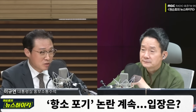지난 19일 방송에는 이규연 대통령실 홍보소통수석이 출연했다. 권 앵커는 이 수석과 대장동 항소 포기와 관련한 검찰 내부 반발에 대해 대화하며 “국민들 중에 꽤 많은 숫자가 지금, 이번 사태를 항명이라고 동의하는 국민들은 특히 ‘검찰 개혁이 이런 검찰들의 저항에 의해서 또 흐지부지되는 거 아니냐’ 이런 걱정을 하시는 분들도 적지 않습니다”라고 말했다.