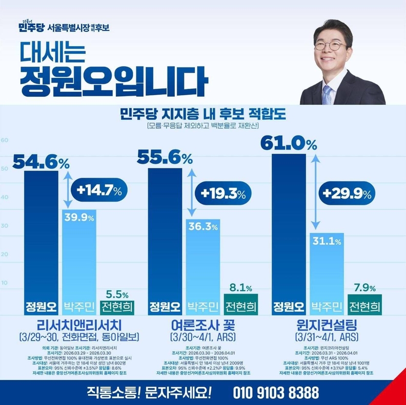 박주민 더불어민주당 의원이 같은 서울시장 예비후보인 정원오 후보 측의 여론조사 홍보물에 대해 "공직선거법 위반"이라고 비판하자, 정 후보가 6일 이에 대해 반박했다.