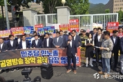 방송통신위원회가 28일 공영방송인 KBS·MBC·EBS의 이사 선임 계획 의결을 앞두자, 과학기술정보방송통신위원회(과방위) 위원장인 최민희 더불어민주당 의원 등 야당 의원들이 김홍일 방통위원장을 규탄하는 기자회견을 열고 면담을 요청했다. 그러자 국민의힘 의원들과 공정언론국민연대(공언련, 상임운영위원장 이재윤), 바른언론시민행동(공동대표 오정근·김형철) 등 9개 단체가 참여한 ‘민주당 공영방송장악 악법 저지 공동투쟁위원회’ 등 여러 시민단체들이 맞불 기자회견으로 대응했다. 김장겸·이상휘·최형두 등 국민의힘 의원과 공투위 등 단체 회원들은 이날 정부과천청사 앞에서 기자회견을 열고 민주당이 김 위원장 탄핵소추안을 당론으로 채택한 것에 대해 “헌법재판소에서 기각될 것이 뻔한데도, 문재인 정부 시절 방송장악 시나리오 등을 근거로 구성된 현재의 MBC 방문진 체제를 무한 연장하겠다는 속셈”이라고 날을 세웠다. 국민의힘 미디어특위 위원장인 이상휘 의원은 “MBC는 특정 정파에 선전, 선동돼 공정을 팔아먹고 방송을 팔아먹었다”며 “MBC는 정파의 전유물이 된 지 오래”라고 지적했다. MBC노동조합(제3노조) 오정환 비상대책위원장은 “민주당과 언론노조가 노리는 것은 MBC