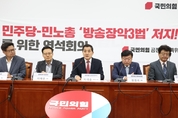 국민의힘 공정언론특별위원회가 10일 주최한 ‘민주당-민노총 '방송장악 3법' 저지를 위한 연석회의’에서 더불어민주당이 재추진하는 ‘방송 3법 개정안’에 대해 박대출 의원은 “더불어민주당과 전국민주노동조합총연맹(민노총) 언론노조의 입맛대로 방송사 이사진을 구성할 수 있는 길 터주는 것”이라고 했으며 김장겸 의원은 “’방송장악 문건’의 완결판”이라고 비판했다. 이날 회의에는 공정언론특위 위원장을 맡은 박대출 의원, 정점식 정책위원장, 김장겸 이상휘 정연욱 의원, 바른언론시민행동 김형철 공동대표, 이재윤 공정언론국민연대 대표, 박기완 언론인총연합회 정책위원장, 김유진 시민단체 ‘길’ 이사, 유정화 경제를 생각하는 변호사모임 미디어감시단장 등이 참석했다. 아래는 참석자들의 발언 요지이다. -박대출 위원장 “숫자의 힘으로 밀어붙이면 거부권 행사의 대상” 박 의원은 “언론은 정쟁의 주체가 아닌 정쟁의 감시자가 되어야 한다. 숫자의 힘으로 밀어붙인다면 거부권 행사의 대상이 될 것임을 경고한다”며 "'방송장악 3법’은 민주당과 민노총 언론노조의 입맛대로 방송사 이사진을 구성할 수 있는 길을 터는 것”이라고 지적했다. 그는 "민주당이 22대 국회 원 구성 협상에서 법제사법위