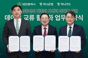 하나은행(은행장 이호성)과 하나카드(대표이사 성영수)는 지난 16일 대전광역시(시장 이장우)와 함께 '데이터 교류 활성화를 위한 업무협약'을 체결하고 지역사회 발전 및 소상공인의 자생력 강화를 위해 상호 협력키로 했다고 밝혔다. 이번 업무협약은 민(民)·관(官)이 데이터 협력을 통해 소상공인을 위한 금융정책 및 상품을 개발해 지역 상권을 활성화하고, ESG 행정 등 지역 현안에 기민하게 대응하기 위해 마련됐다. 이를 위해 하나은행과 하나카드는 ▲지역 상권 현황 ▲소상공인 금융거래 동향 ▲소비 트렌드 ▲외국인 손님 분석 등 다양한 금융거래 데이터를 대전광역시와 교류할 계획이며, 대전광역시는 제공받은 데이터를 통해 ▲지역경제 활성화 ▲관광정책 ▲지역화폐 분석 등 보다 정밀한 소상공인 지원 정책을 수립하는 데 활용할 예정이다. 대전광역시청에서 진행된 이날 협약식에서 성영수 하나카드 대표와 이동열 하나은행 충청영업그룹 부행장은 침체된 지역경제의 위기 극복 및 균형 성장의 필요성을 함께 공감하고, 정책마련을 위한 데이터 활용 이외에도 지역화폐, 정책금융, 축제·행사 등 정책효과 분석에도 협업키로 했다. 특히, 하나은행과 하나카드가 보유한 ▲소상공인 업종·규모별 분석