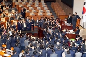 27일 한덕수 대통령 권한대행에 대한 탄핵소추안 표결 결과, 찬성표는 192표로 집계됐다. 우원식 국회의장은 이것을 탄핵소추 가결로 선언했다. 국민의힘은 우 의장이 가결 정족수를 '단순과반수'라고 밝힌 이후 의장석 앞에서 '원천무효'와 '의장 사퇴'를 외쳤지만 '가결 선언'을 막지는 못했다. 한덕수 권한대행은 국회 표결 직후 "(헌법재판관 임명에 대해) 여야 합의를 청하는 말씀에 대하여 야당이 합리적 반론 대신 이번 정부 들어 스물아홉번째 탄핵안으로 답하신 것을 저 개인의 거취를 떠나 이 나라의 다음 세대를 위해 안타깝게 생각한다"며 "저는 국회의 결정을 존중하며, 더이상의 혼란과 불확실성을 보태지 않기 위하여 관련법에 따라 직무를 정지하고 헌법재판소의 신속하고 현명한 결정을 기다리겠다"고 밝혔다. 송원근 기자