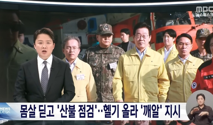 지난 6일 뉴스데스크는 강원 지역 산불 소식을 전하며 <몸살 딛고 ‘산불 점검’...헬기 올라 ‘깨알’ 지시>란 제목으로 리포트를 냈다. 뉴스데스크는 “이재명 대통령이 강원도 원주의 산림항공본부를 찾아 직접 산불 진화 점검에 나섰다”면서 “퇴역하는 군 헬기를 개조해 산불용으로 투입하라는 즉석 지시를 하고, 산림청과 군, 지자체에는 공조 시스템을 갖춰 초기 대응에 전력을 집중해 줄 것을 당부했다”고 보도했다.