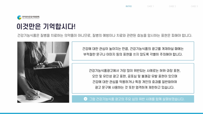 이 영상은 자율 규제 실효성 제고와 서약 매체의 광고윤리 인식 강화를 위해 15분 분량의 영상으로 만들었으며 소비자에게 직접적인 피해 가능성이 높은 건강기능식품, 금융 상품, 화장품 등의 표현 유형과 주요 위반 사례를 중심으로 구성됐다.