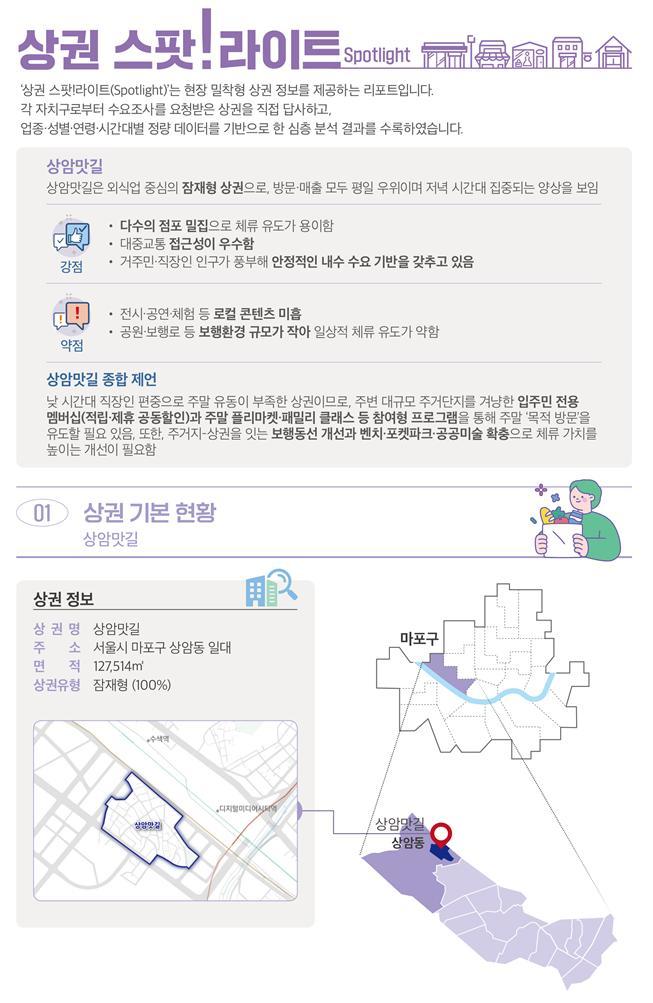 올해에는 처음으로 상권 발전을 위한 지역 인프라와 지역 상인의 의견 분석 내용을 포함한 ‘현장밀착 상권분석’을 도입해 통계 중심의 분석이 아닌 현장 중심의 데이터 해석과 직접적으로 정책에 반영할 수 있는 새로운 분석 결과를 제공했다.