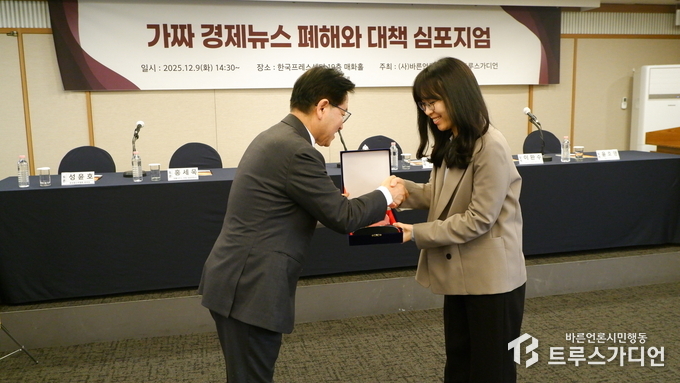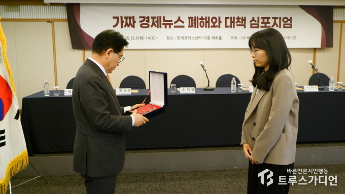 가짜뉴스 척결과 바른언론 생태계 조성 운동을 벌이고 있는 사단법인 바른언론시민행동(공동대표 오정근·김형철)이 9일 프레스센터에서 ‘가짜 경제뉴스의 폐해와 대책’을 주제로 심포지엄을 개최한 가운데, 이날 <올해의 바른언론홍보대상> 수상은 박수현 광동제약 커뮤니케이션 팀장에게 돌아갔다.