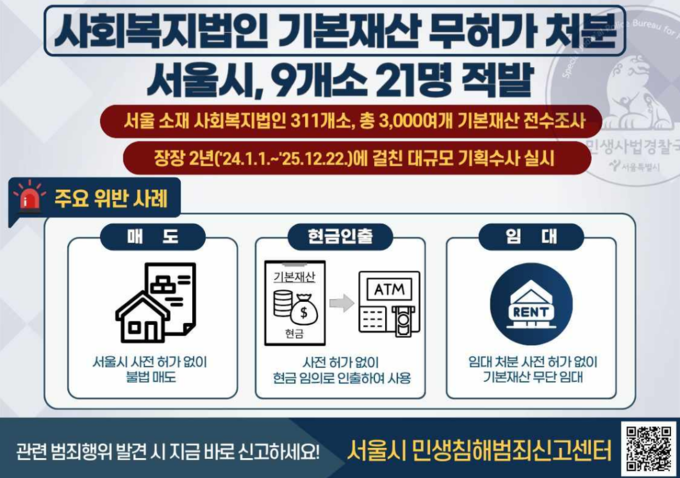 서울시 민생사법경찰국이 기본재산을 시·도지사 허가 없이 임의로 매도, 임대 등을 한 사회복지법인 9개소 21명을 적발해 수사 중이라고 5일 밝혔다.