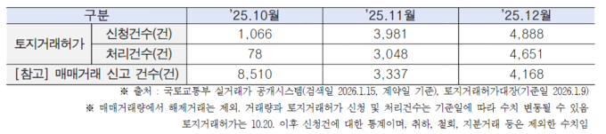 시는 “토지거래허가 처리 기간이 기존 최대 30일에서 10·15 대책 이후 계약 체결 전 과정이 추가되면서, 실거래 신고까지 최대 50일이 소요되고 있다”며 “이로 인해 정보 공백과 거래량 급감에 따른 착시 현상이 발생해 시장 혼란이 가중되고 있는 상황”이라고 설명했다.