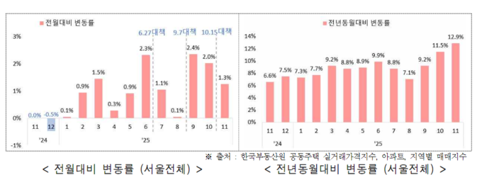 실거래 가격지수도 상승했다. 지난해 11월 서울 아파트 매매 실거래 가격은 전월 대비 1.28% 상승했으며, 전년 동월과 비교하면 12.95%의 높은 상승폭을 기록했다.