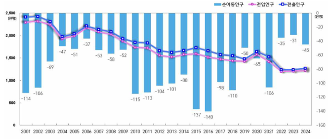 분석 기간 동안 서울시 인구의 순이동(전입-전출)은 전출이 전입보다 많은 ‘순유출 구조’를 유지하고 있다. 하지만 2024년 기준 순이동(전입-전출)은 –4만 4692명으로, 2001년 –11만 3949명보다 순유출 규모가 절반 이하로 줄어들었다.