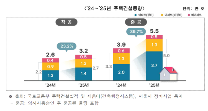 지난해 서울에 착공된 주택은 3만 2000호로 전년 대비 23.2% 증가했으며, 이 중 아파트 착공은 2만 7000호로 전년 대비 24.3% 증가했다. 아파트 착공 중 정비사업 물량은 50.9%인 1만 4000호이며 전년 대비 3.7% 개선됐다.