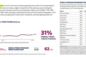 영국 옥스퍼드대학교 부설 로이터저널리즘연구소가 17일(현지시간) 발간한 ‘디지털 뉴스 보고서(Digital News Report) 2024’에 따르면 대한민국 사람들의 뉴스 신뢰도는 전반적으로 낮은 편으로, 2024년에는 응답자의 31%가 뉴스를 신뢰한다고 응답했다. 이는 작년보다 약간 증가한 수치였다. MBC, YTN, JTBC, SBS, KBS 등 방송 미디어에 대한 신뢰가 상대적으로 높으며, 조선일보, 중앙일보, 동아일보, 한겨레, 경향신문 등의 신문에 대한 신뢰는 비교적 낮은 편으로 나타났다. 로이터저널리즘연구소가 일부 한국 미디어를 대상으로 조사한 신뢰도 평가에서 MBC가 신뢰도 57%를 얻어 한국 사람들이 가장 신뢰하는 미디어 브랜드로 평가받았다. 이어 YTN이 56%로 2위, JTBC가 55% 3위, KBS 뉴스와 연합뉴스TV가 51%로 4위로 나타났다. 조선일보는 신뢰도가 34%, 동아일보는 38%로, 한겨레 39%, 중앙일보 37%에 그쳤다. 온라인 포털을 주도로 한 네이버가 대한민국에서 가장 많은 뉴스 소비 점유율을 차지하고 있으며, 그 뒤를 방송매체, 소셜 미디어, 인쇄 매체가 이어가고 있었다. 연구소는 “한국의 언론매체는 경쟁적인 공영매